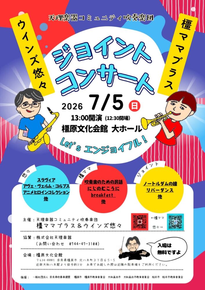 (株)天理楽器 TEL:0744-47-3100 主催:天理楽器コミュニティ吹奏楽団 橿ママブラス&ウインズ悠々 |